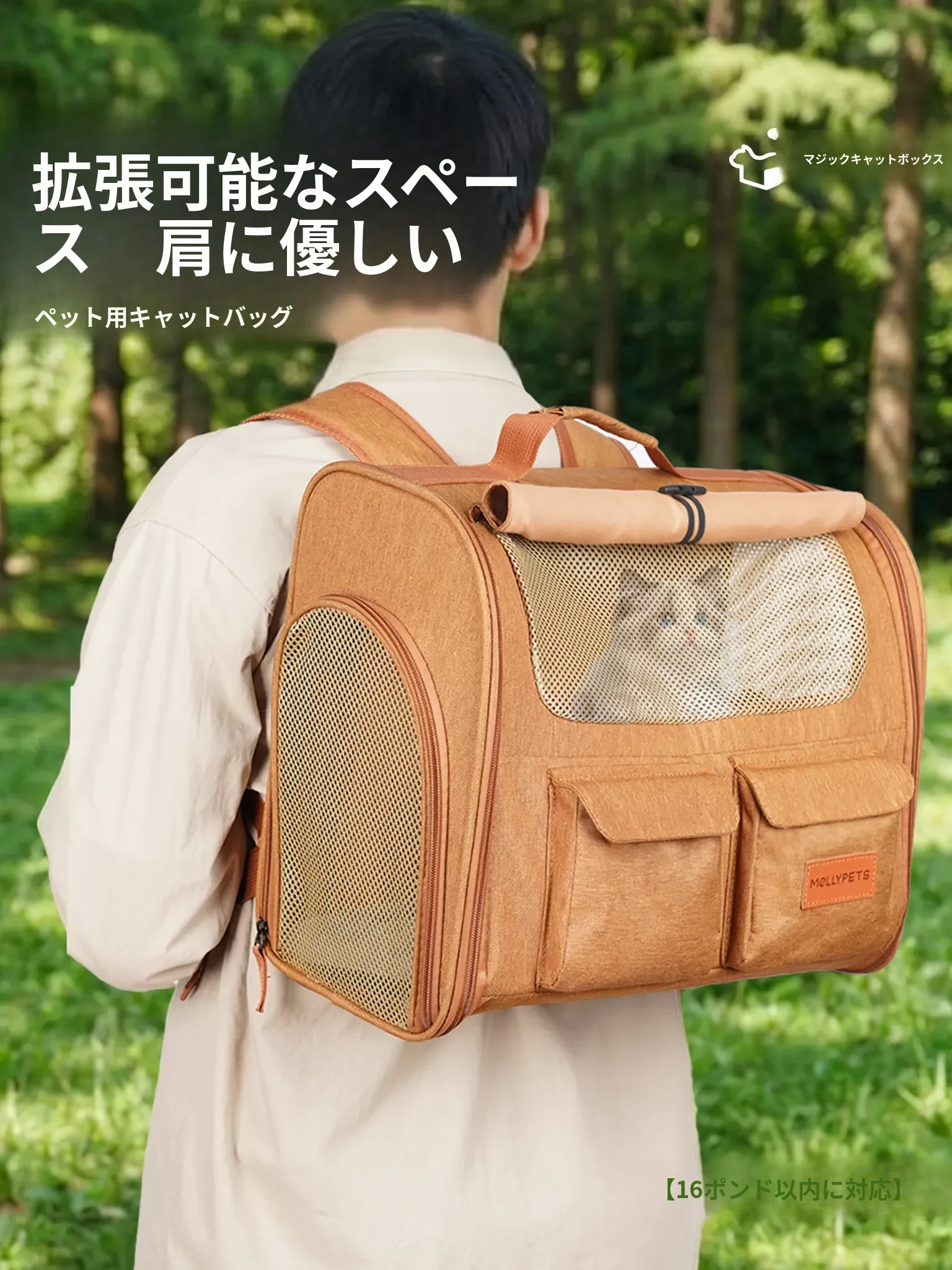猫用キャリーリュック - 軽量・通気性抜群!拡張可能な大容量で、折りたたみ式。お出かけに最適なペット用バッグ!あなたの猫ちゃんと一緒に楽しい冒険を!